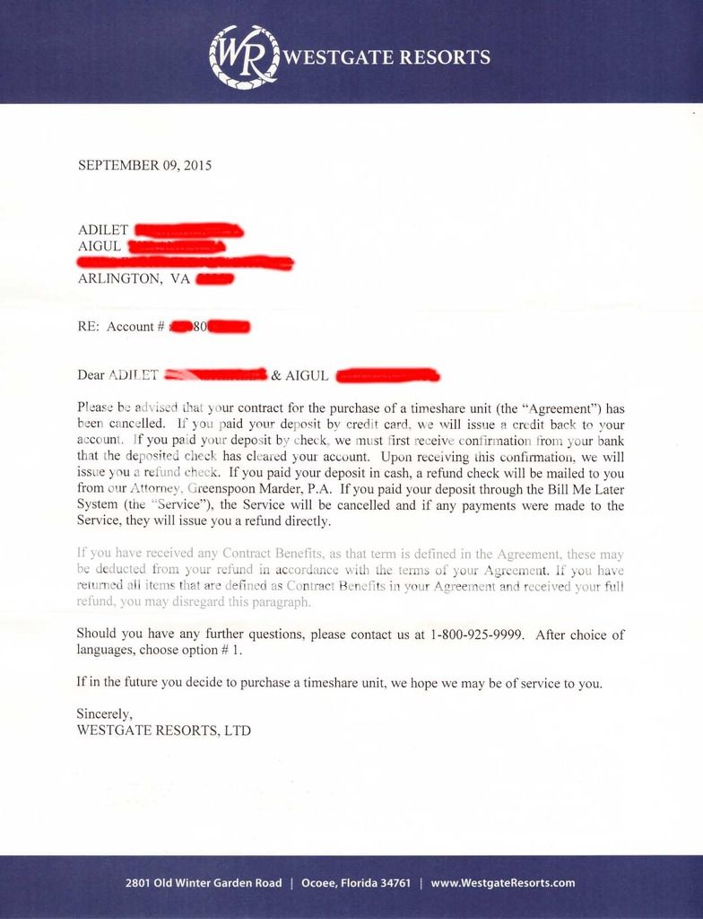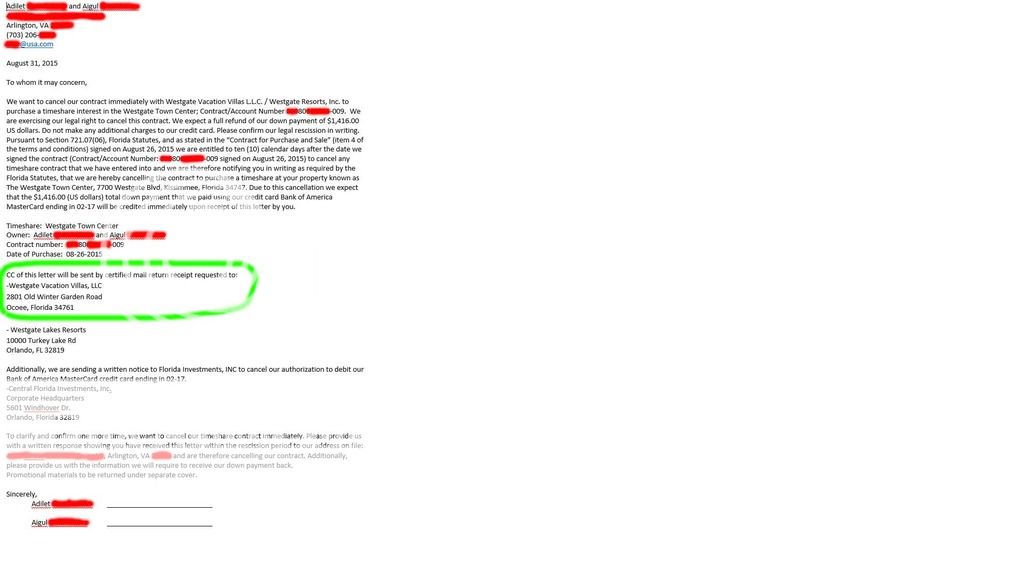 Pursuant to Section 721.07(06), Florida Statutes, and as stated in the “Contract for Purchase and Sale” (item 4 of the terms and conditions) signed on August 26, 2015 we are entitled to ten (10) calendar days after the date we signed the contract (Contract/Account Number: XXX80XXXXXX-009 signed on August 26, 2015) to cancel any timeshare contract that we have entered into and we are therefore notifying you in writing as required by the Florida Statutes, that we are hereby cancelling the contract to purchase a timeshare at your property known as The Westgate Town Center, 7700 Westgate Blvd, Kissimmee, Florida 34747. Due to this cancellation we expect that the $1,416.00 (US dollars) total down payment that we paid using our credit card Bank of America MasterCard ending in XX-XX will be credited immediately upon receipt of this letter by you.